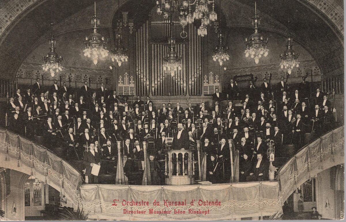 Edit. V.G. [= Victor Grégoire],42, Avenue du Midi, Bruxelles, N°200. - L'Orchestre du Kursaal d'Ostende. Directeur Monsieur Léon Rinskopf. - Interieur van de grote rotonde.