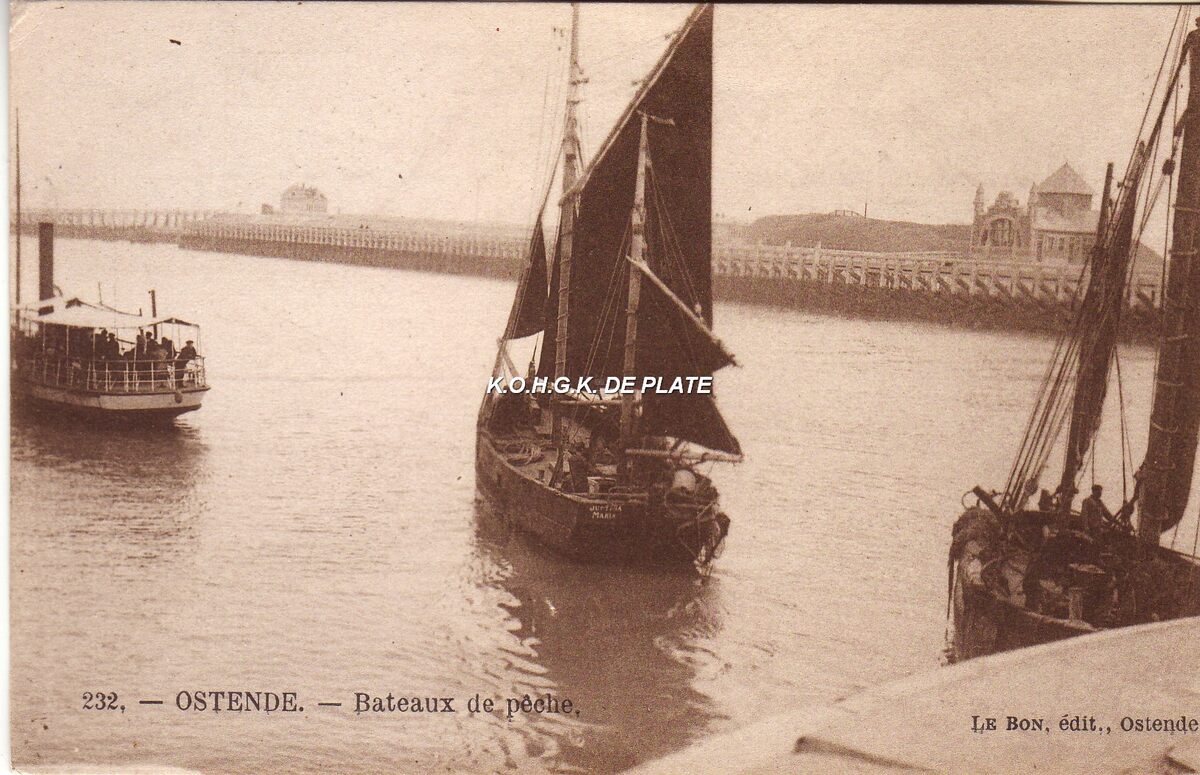 Le Bon, édit., Ostende, N° 232. - Ostende - Bateaux de pêche. Twee Oostendse tweemastsloepen in de haven van Oostende. Links, detail van een pleziervaartuig. We zien het Ooststaketsel, met rechts het Quarantaine gebouw en links het gebouw aan de Leopoldsluis