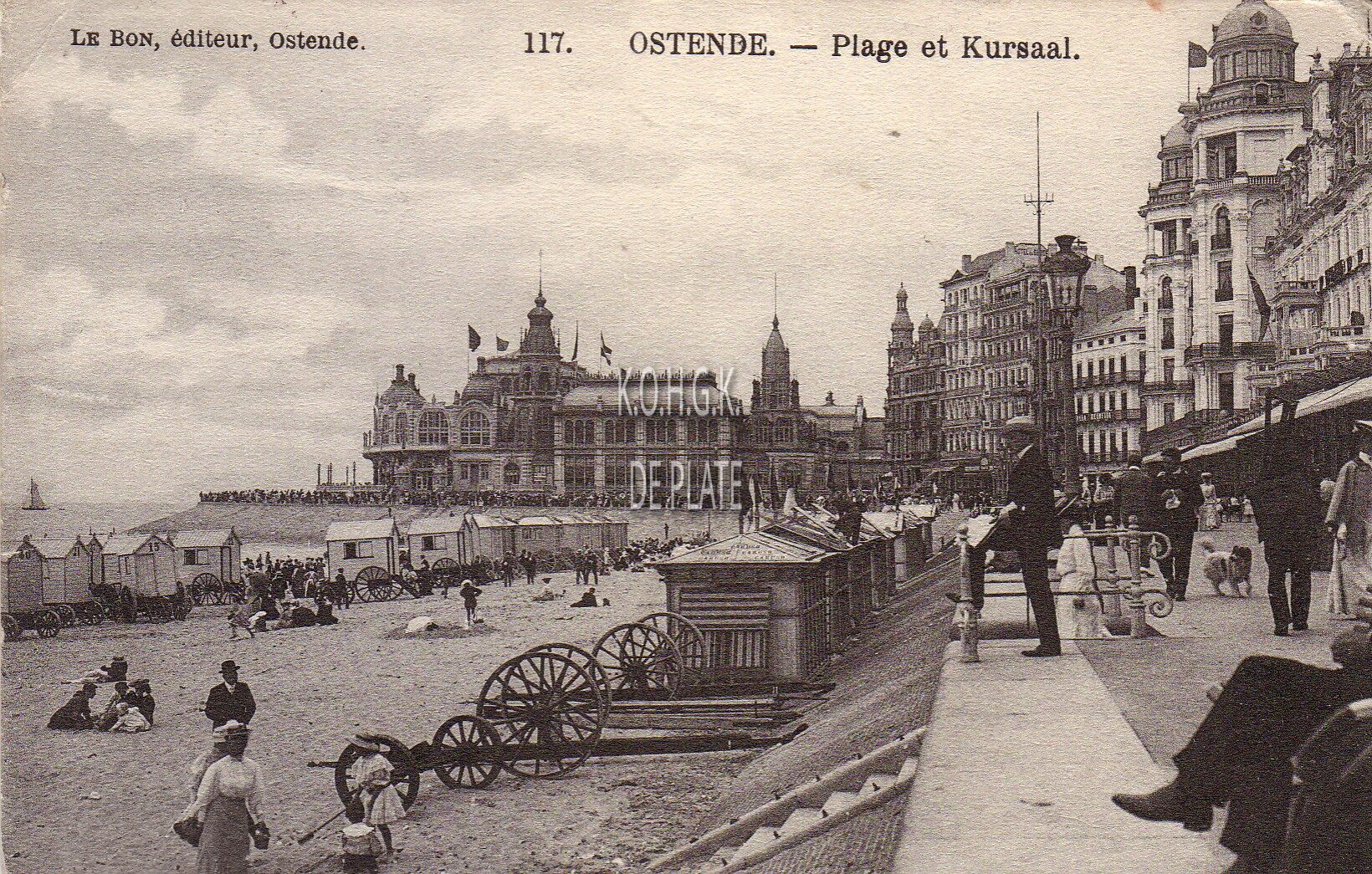 Le Bon, éditeur, Ostende, N° 117. - Ostende - Plage et Kursaal. - De badkarren op het Groot Strand nabij de westelijke gevel van het derde Kursaal gelegen langs de Zeedijk. Rechts, de grote hotels langs de Zeedijk.