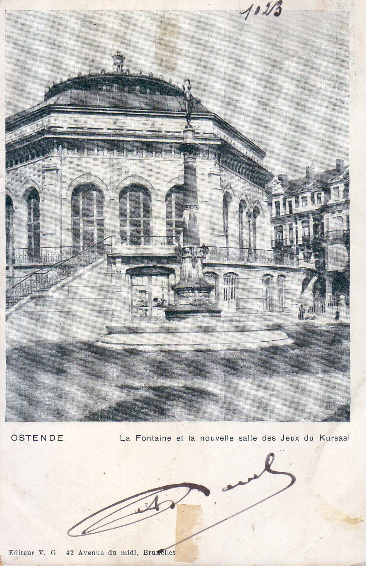 Edit. V.G. [= Victor Grégoire], 42, Avenue du Midi, Bruxelles. - Ostende - La Fontaine et la nouvelle salle des Jeux du kursaal. - Gedeelte van de hovingen langs de zuidgevel van het derde Kursaal. Het beeldhouwwerk op de zuil nabij de Kursaal- Oosthelling wordt besproken, zie inventarisnummer 2020/0418