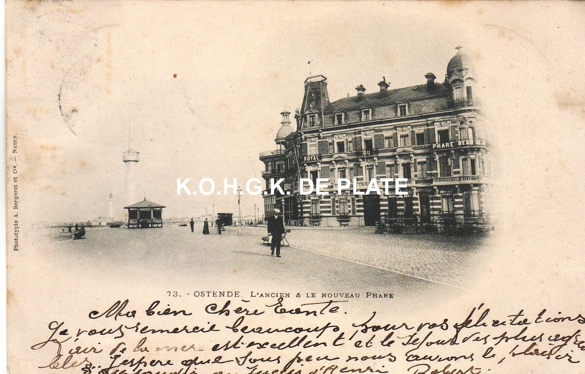 Phototypie A. Bergeret et Cie Nancy, nr.73. - Ostende - L'ancien & le nouveau phare. - De Zeedijk met de eerste vuurtoen, genaamd "De Vlaggestok", en op de achtergrond de tweede vuurtoren op de oosteroever. Nabij de vuurtoren een verplaatsbare kiosk en rechts, het "Royal Phare Hotel"