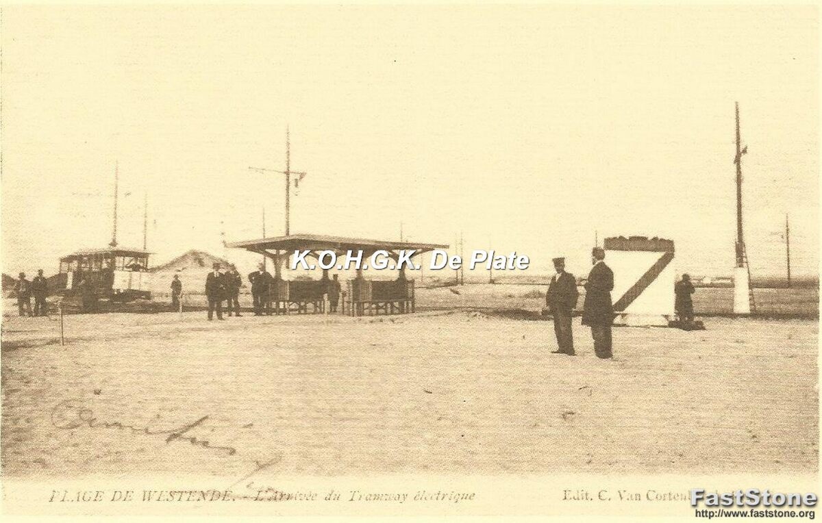 Een open motorrijtuig (reeks 9997-9999) met open bijrijtuig van hetzelfde type (afgeronde balkons) komt toe van Oostende en gaat de lus maken om terug te keren. Bemerk het eenvoudig maar sierlijk wachthuisje met zitbanken.