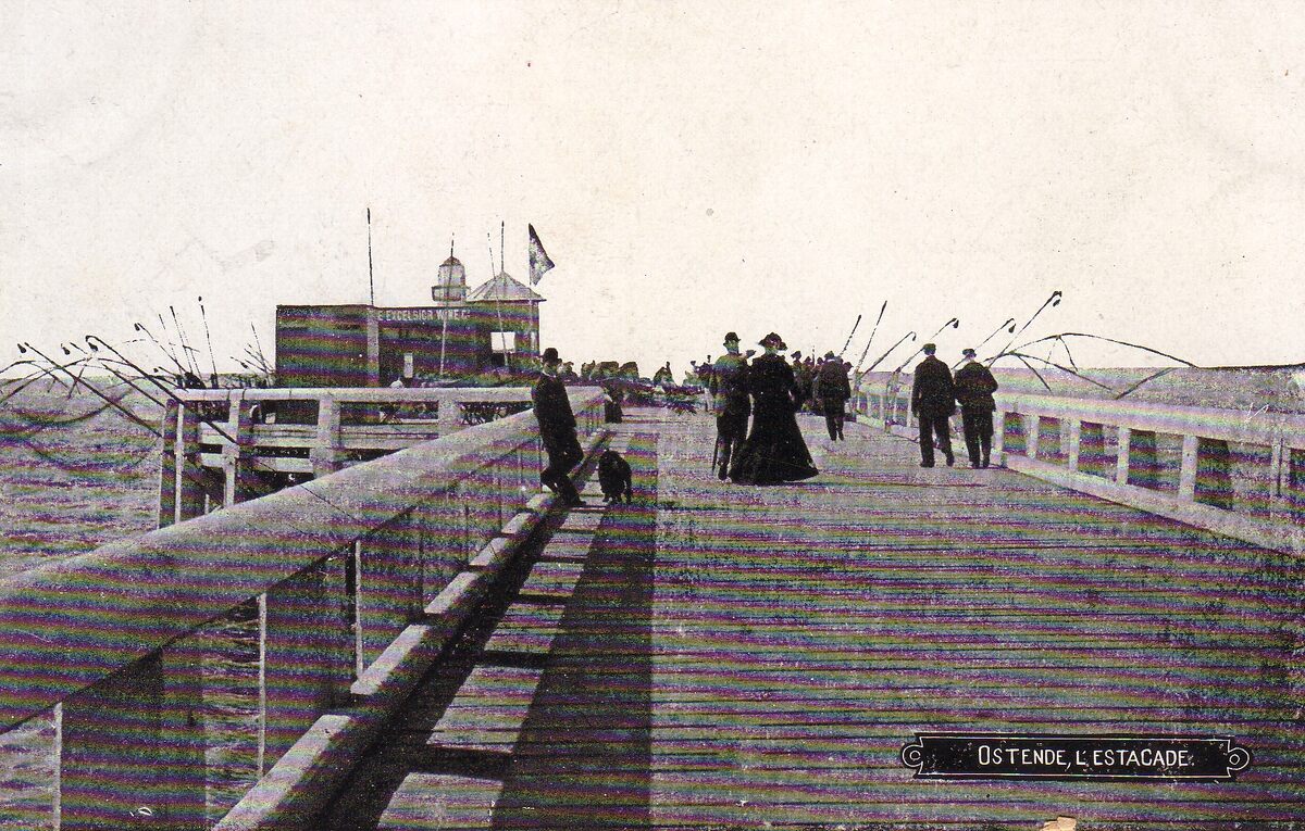 Ed. V.G. [=Victor Grégoire], 42 avenue du midi, Bruxelles. - Ostende, l'estacade. - Een zicht op het einde van het Weststaketsel met aan weerszijden vissers met kruisnetten en paviljoen van "The Exelsior Wine C°"