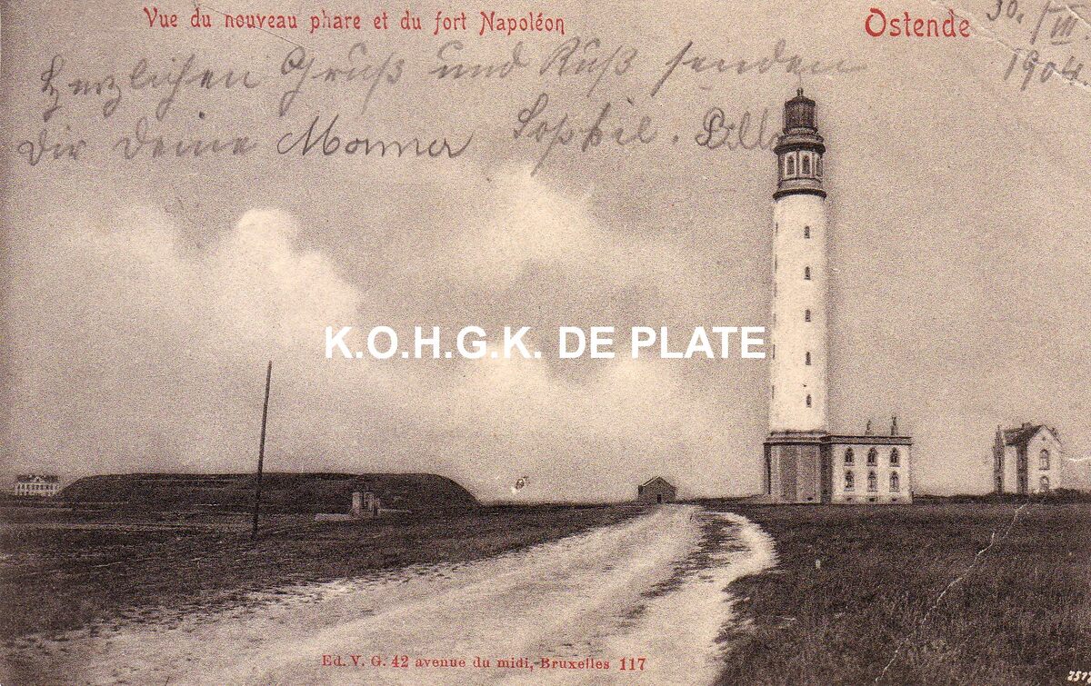 Edit. V.G. [=Victor Grégoire],42, Avenue du Midi, Bruxelles, N° 117. - Ostende - Vue di nouveau phare et du fort Napoleon. De tweede vuurtoren op de oosteroever. Links, het militair bouwwerk "De Halve Maan"