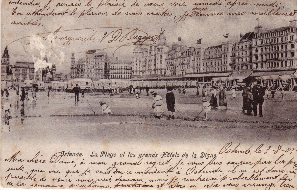 Ostende - La Plage et les grands Hôtels de la Digue. - Strandrecreatie op het Groot Strand en rechts, de tradtitionele badkarren. De Zeedijk, met de grote hotels en links, gedeelte van de westgevel van het derde Kursaal