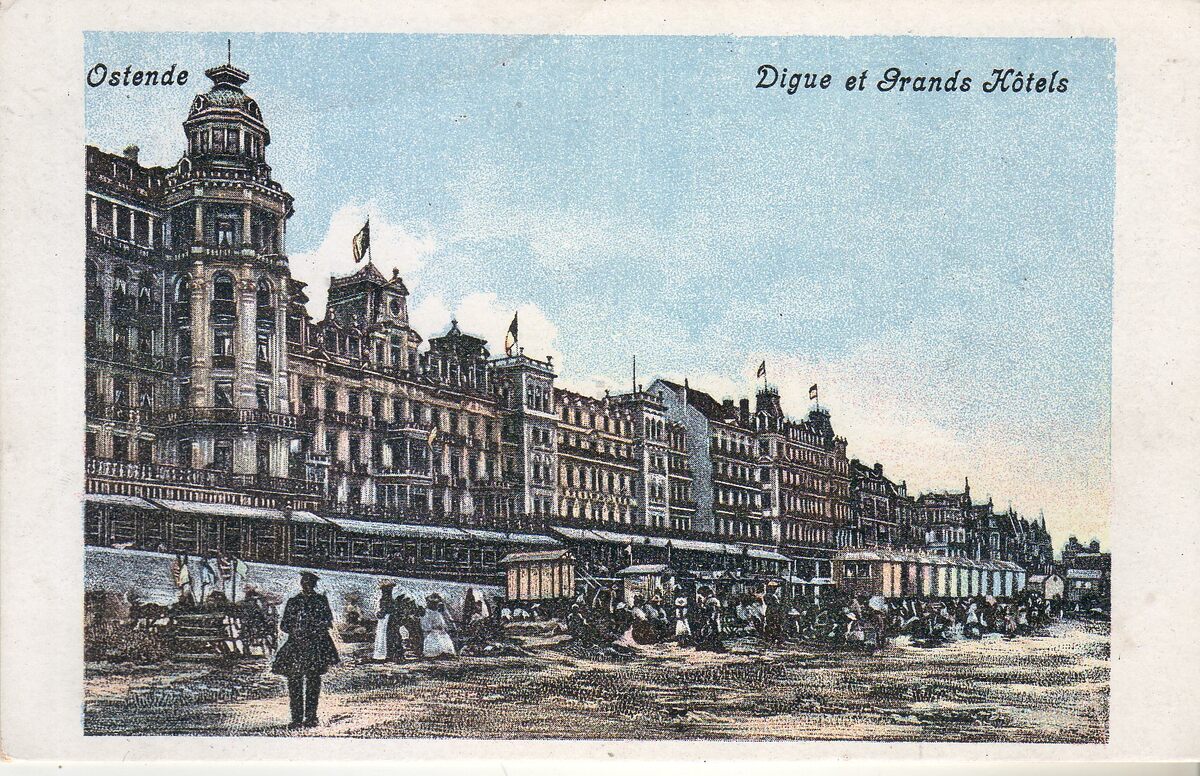 Theys. - Ostende - Digue et Grands Hôtels. - Bijgekleurde kaart. - Strandrecreatie op het Groot Strand met de traditionele badkarren. De grote hotels langs de Zeedijk, met links, Hotel Continental.