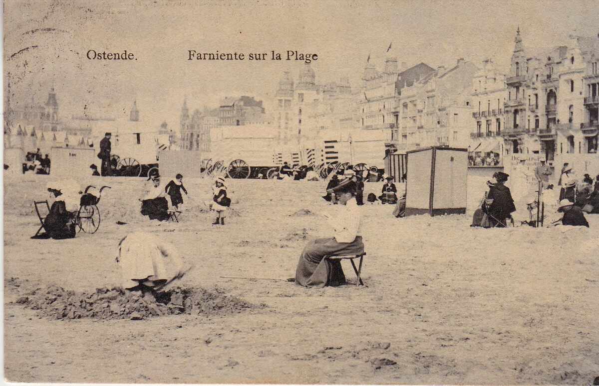Edit. J. Schadeck, rue Longue, 7, Ostende. - Ostende - Farniente sur la plage. - Een rustige zomerdag op het Groot Strand. Rechts, de Zeedijk met de grote hotels en op het einde nog een glimp van de westgevel van het derde Kursaal.