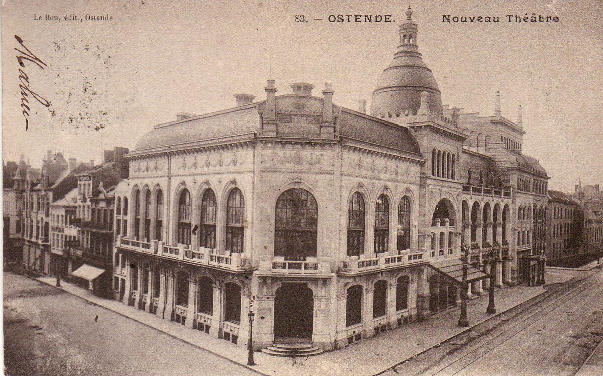 Le Bon, édit., Ostende, nr. 83. - Ostende - Nouveau Théâtre. - De Koninklijke Schouwburg op de hoek van de Vlaanderenstraat (links) en de Van Iseghemlaan (rechts). Gebouwd naar de plannen van architect Alban Chambon