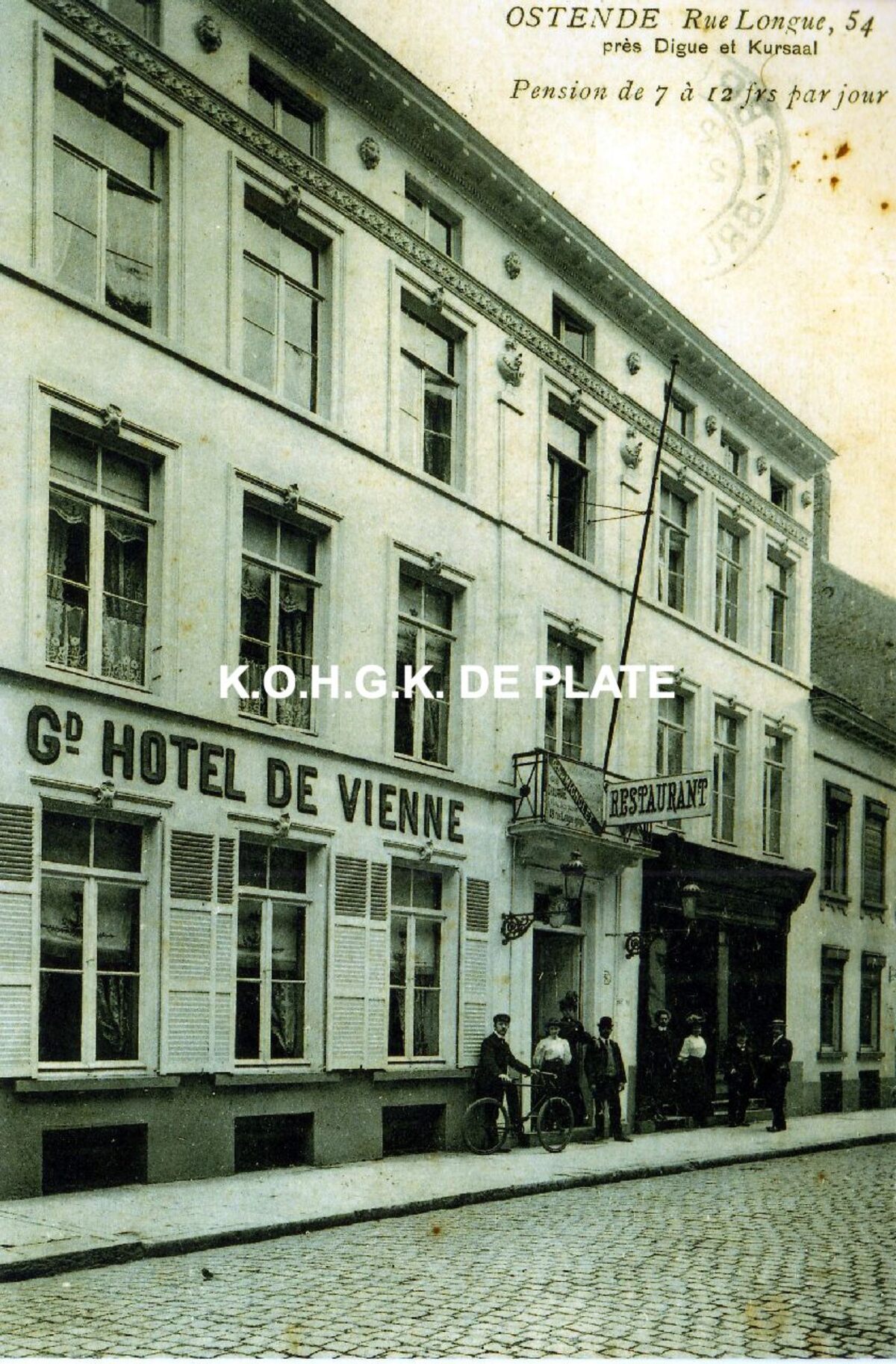 Afdruk.- Formaat : 19 x 12.5 cm. Langestraat 54 : Grand Hôtel de Vienne werd uitgebaat door Hector Vindevogel. Hier werd de geschiedenis van de Oostendse cinema's geschreven. In 1907 werden in de feestzaal van het hotel de eerste filmvoorstellingen gegeven. De grote zaal werd omgevormd tot cinema en op 4 juni 1908 geopend met films van "Cinéma Pathé Frères". Zo is Cinema Pathé geboren. Het gebouw veranderde van eigenaar en het hotel heette toen Hôtel Concordia.