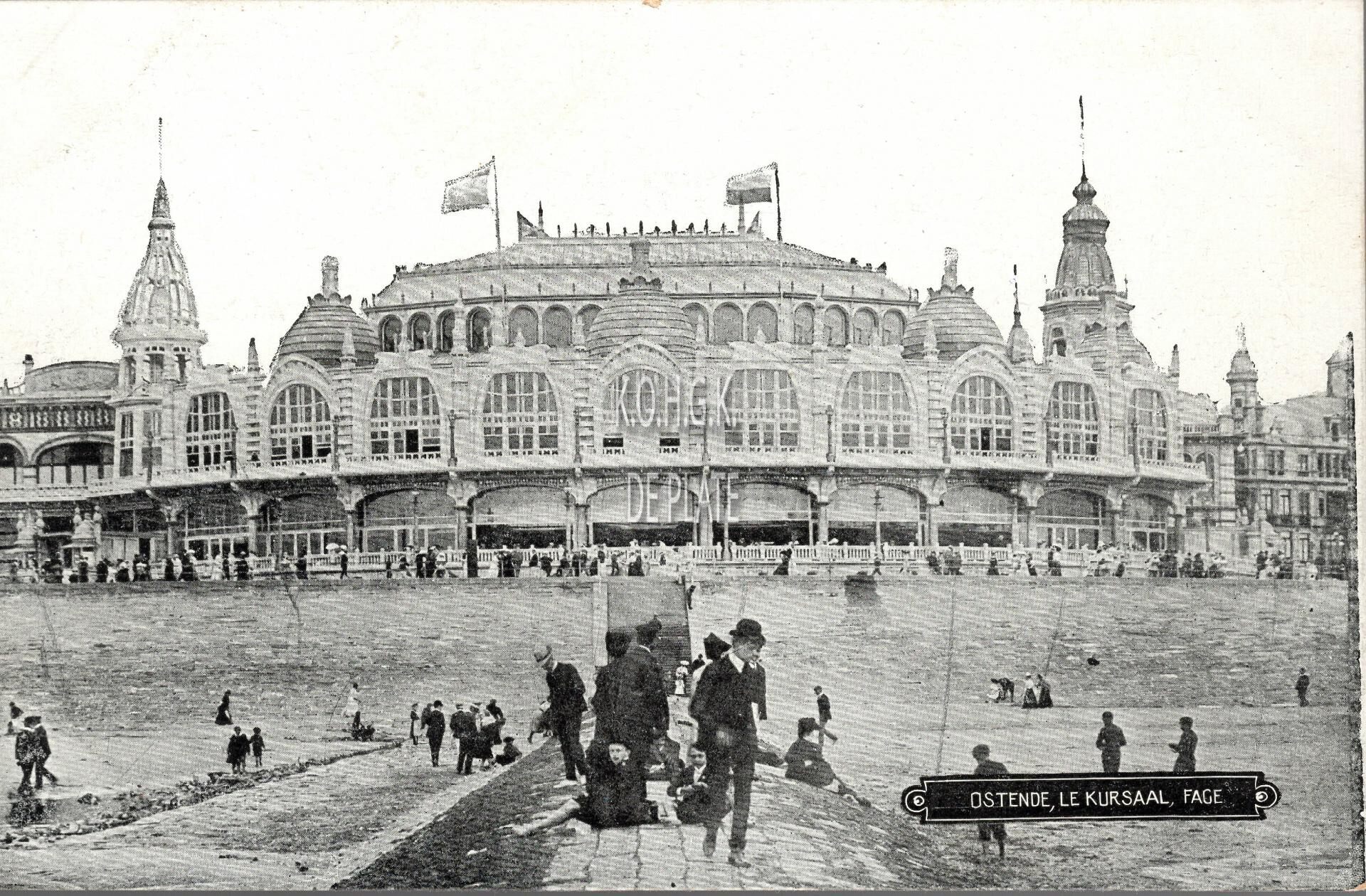 Edit. V.G. [=Victor Grégoire], 42, avenue de Bruxelles. - Ostende - Le Kursaal, face. - De noordgevel van de derde Kursaaal langs de Zeedijk, gezien vanaf een golfbreker op het Groot Strand