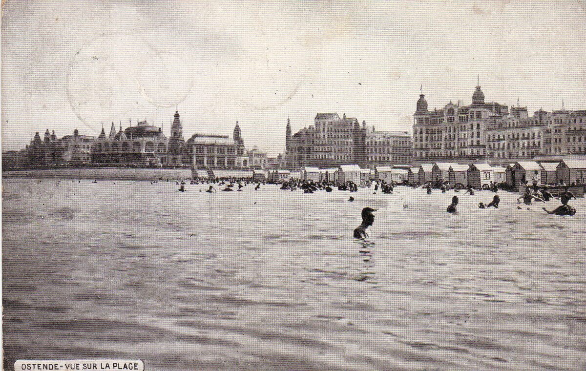 VO-DW. - Ostende - Vue sur la plage. - Zicht vanuit de zee op het Groot Strand. De grote hotels langs de westzijde van de Zeedijk. - Het derde kursaal