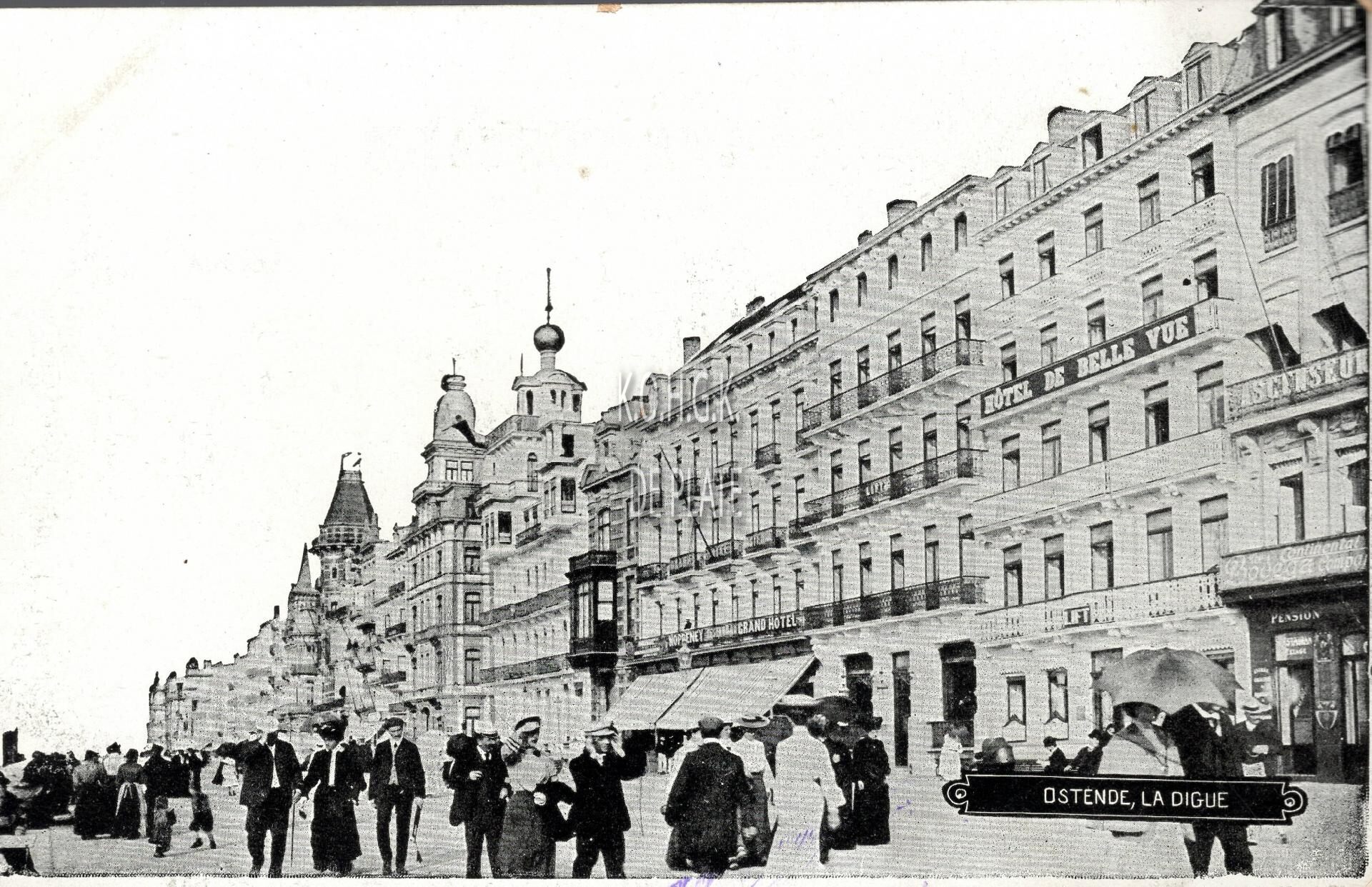 Formaat : 9 x 14 cm. - Ostende, La Digue. De Zeedijk vanaf Kursaal-Oosthelling richting havengeul tijdens een zonnige namiddag. Rechts het "Hôtel de Belle Vue".
