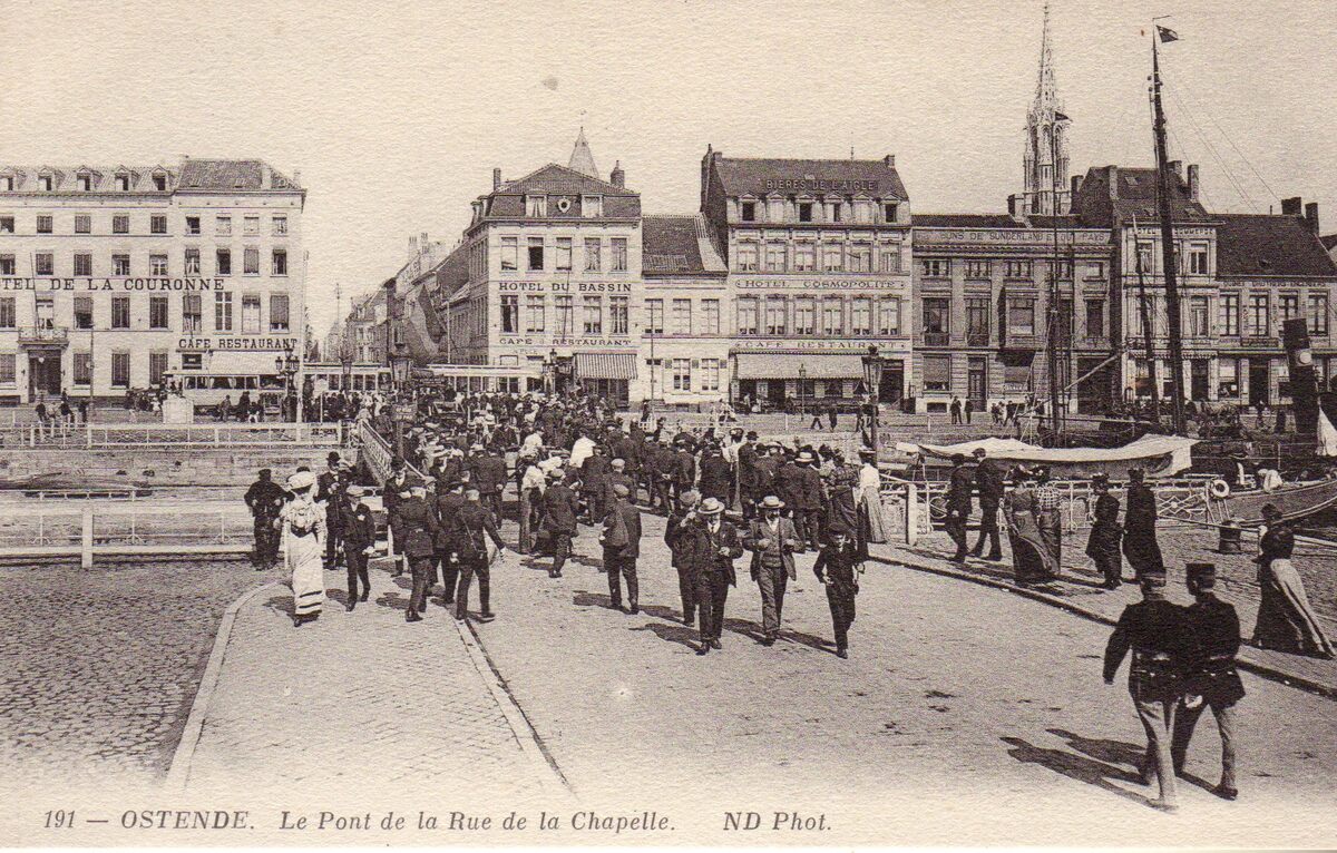Postkaart : ND Phot, nr.191 (Neurdein). Ostende - Le Pont de la Rue de la Chapelle. De Kapellebrug richting Kapellestraat. De handelsdokken en de Keizerskaai. Met o.a. van links naar rechts : Hôtel de la Couronne, de Kapellestraat, Hôtel du Bassin, Hôtel Cosmopolite, kolenhandel Oscar Helsmoortel (Keizerskaai 10)