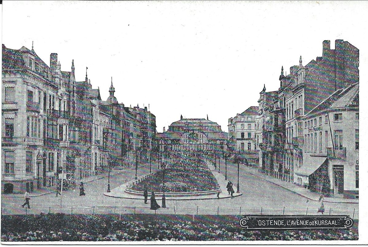 Formaat : 9 x 14 cm. - Ostende, l'avenue du Kursaal. - De Leopoldlaan gezien vanaf het Leopoldpark met op het einde de derde Kursaal. Vooraan, links en rechts, de Karel Janssenslaan