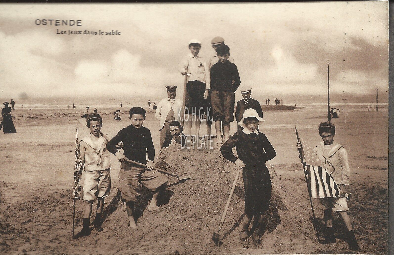 Edit. V.G.[Victor Grégoire], 42, Avenue du Midi, Bruxelles. Ostende - Les jeux dans le sable. - Kinderen bouwen een fort (zandkasteel). Map 041D/85