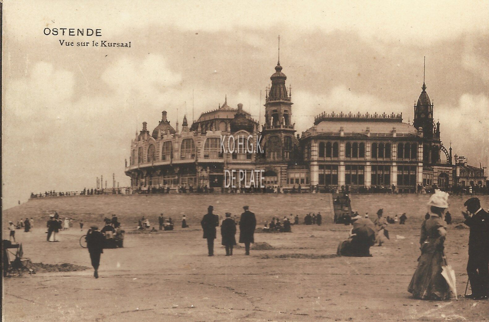 Edit. V.G.[Victor Grégoire], 42, Avenue du Midi, Bruxelles. - Ostende - Vue sur le Kursaal. - De westgevel. Strandrecreatie op het "groot strand" bij eb. Map 041D/85