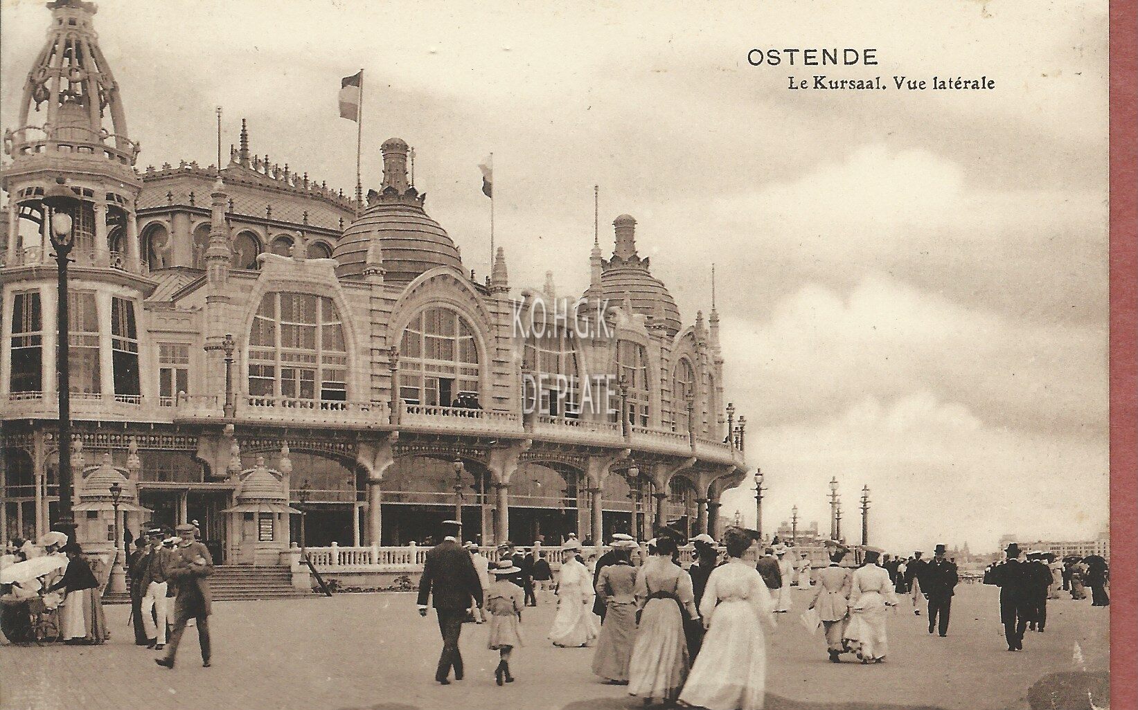 Edit. V.G.[Victor Grégoire],42, Avenue du Midi, Bruxelles. - Ostende - Le Kursaal. Vue latérale. - Oostende in de Belle Epoque. Detail van de noordgevel, met links, "La tourelle fleurie" en één van de eerste straatlantaarns met elektrische verlichting. - Map 041D/85