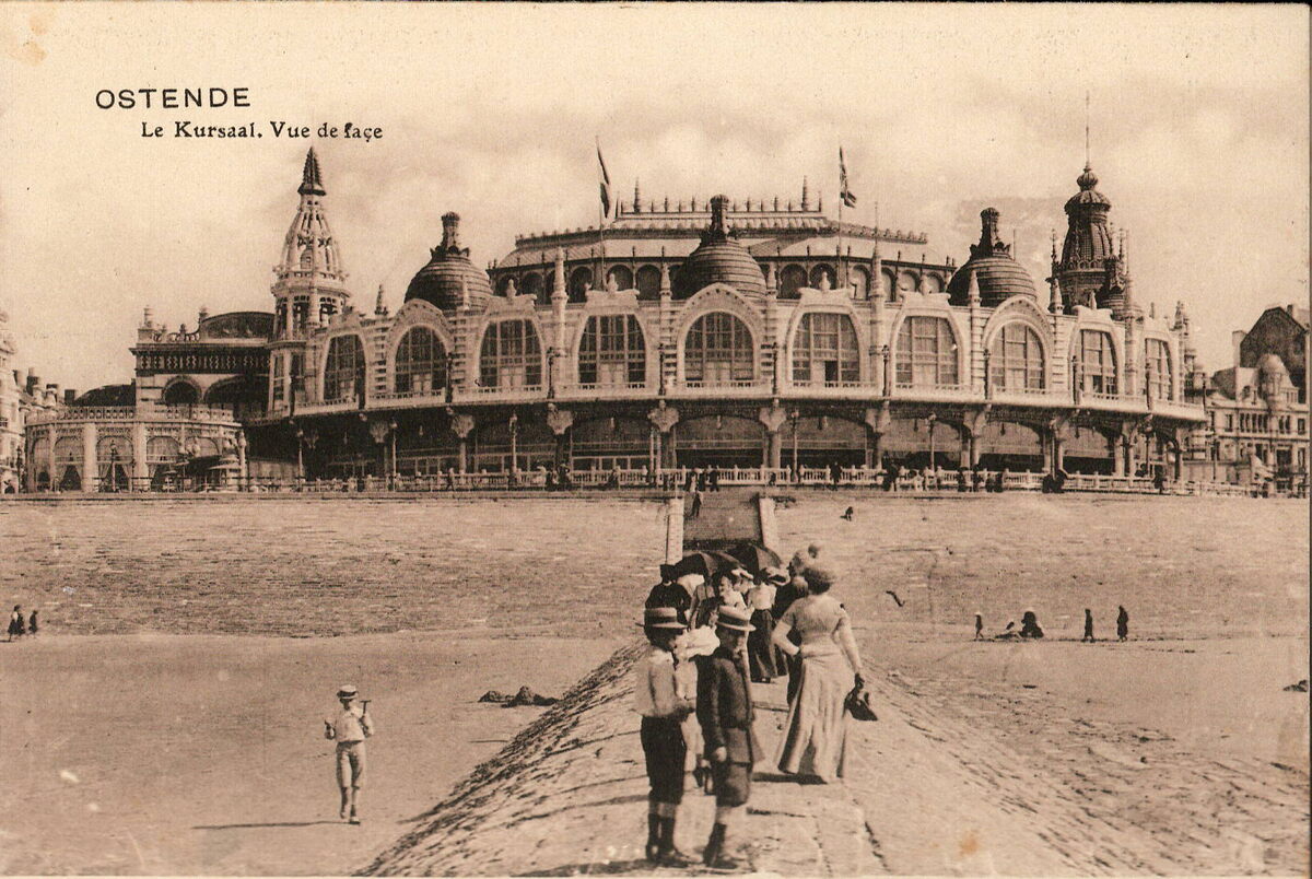Edit. V.G.[Victor Grégoire], 42, Avenue du Midi, Bruxelles. - Ostende - Le Kursaal. Vue de façe. - De noordgevel. Het "groot strand". Wandelen op de golfbreker.
