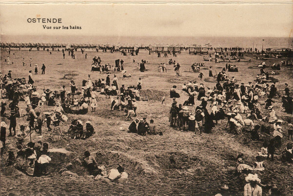 Edit. V.G.[Victor Grégoire], 42, Avenue du Midi, Bruxelles. - Ostende - Vue sur les bains. - Het "groot strand" bij eb met aan de vloedlijn de badkarren.