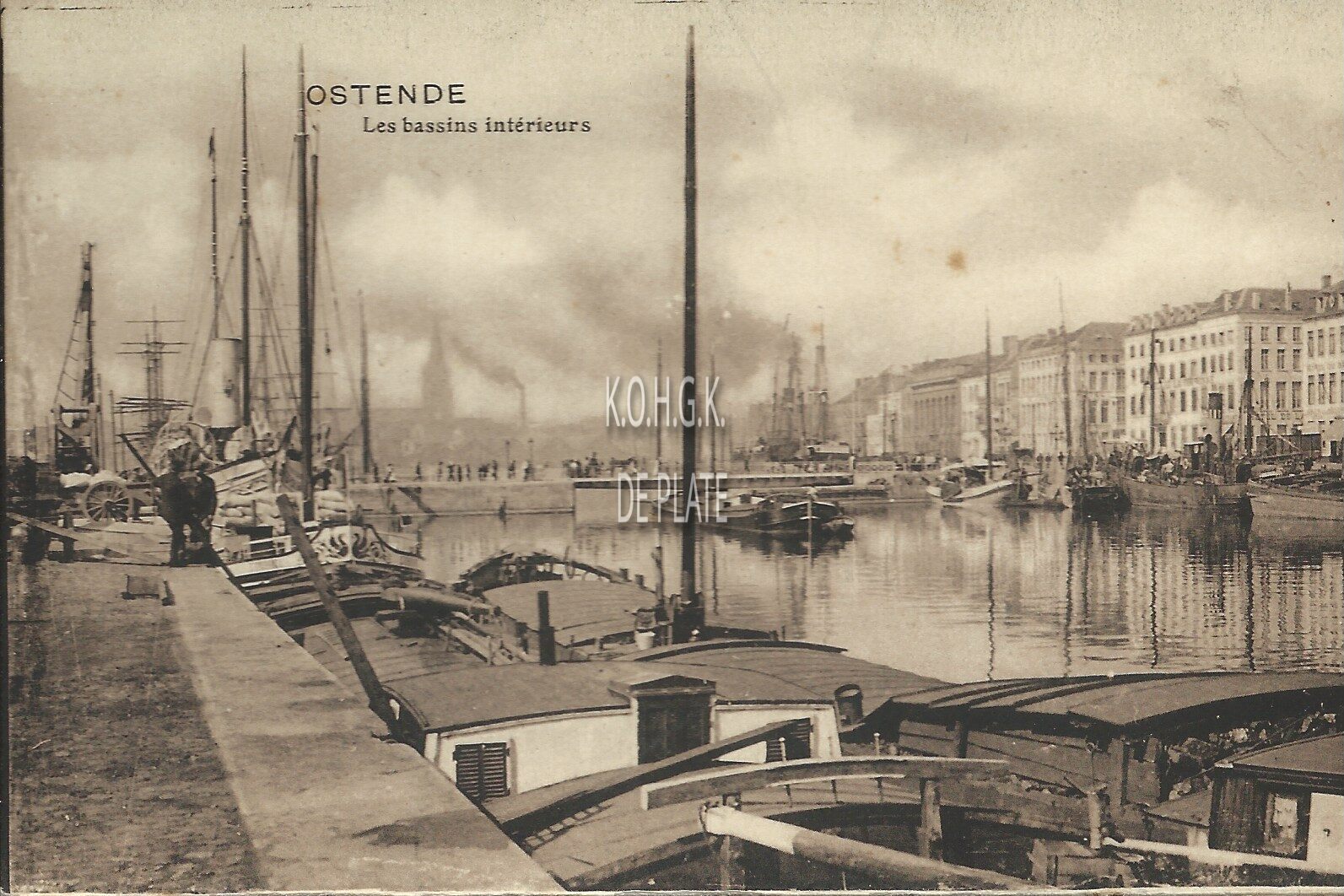 Edit. V.G.[Victor Grégroire], 42, Avenue du Midi, Bruxelles. - Ostende - Les bassins intérieurs. Het eerste handelsdok met vooraan binnenschepen aangemeerd en rechts vissersvaartuigen aan de Keizerskaai. Map 041D/85