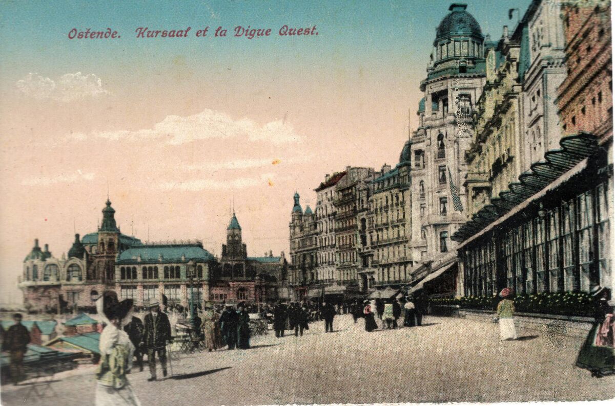 Formaat : 9 x 14 cm. - N. & C., Br. N°4086. - Ostende - Kursaal et la Digue Ouest. - Gekleurde kaart. - De Zeedijk met de grote hotels en zicht op de westgevel van het derde kursaal.