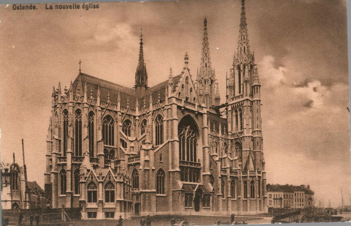 Formaat : 9 x 14 cm. - Sté Daveluy. Imp. Lith de la Cour,[Rue de la Chapelle], Ostende. - Ostende - La Nouvelle église. - Kaart lichtbruin.