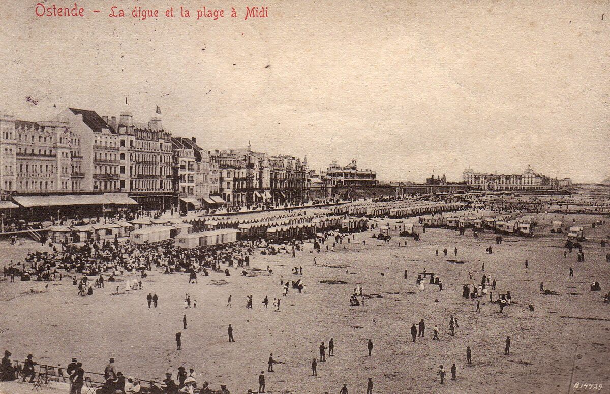 Edit. V.G. [=Victor Grégoire], 42, Avenue du Midi, Bruxelles. - Ostende - La digue et le plage à midi. - De Zeedijk en het Groot strand gezien vanaf het Kursaal richting het Royal Palace Hotel. In het midden, het Koninklijk Chalet