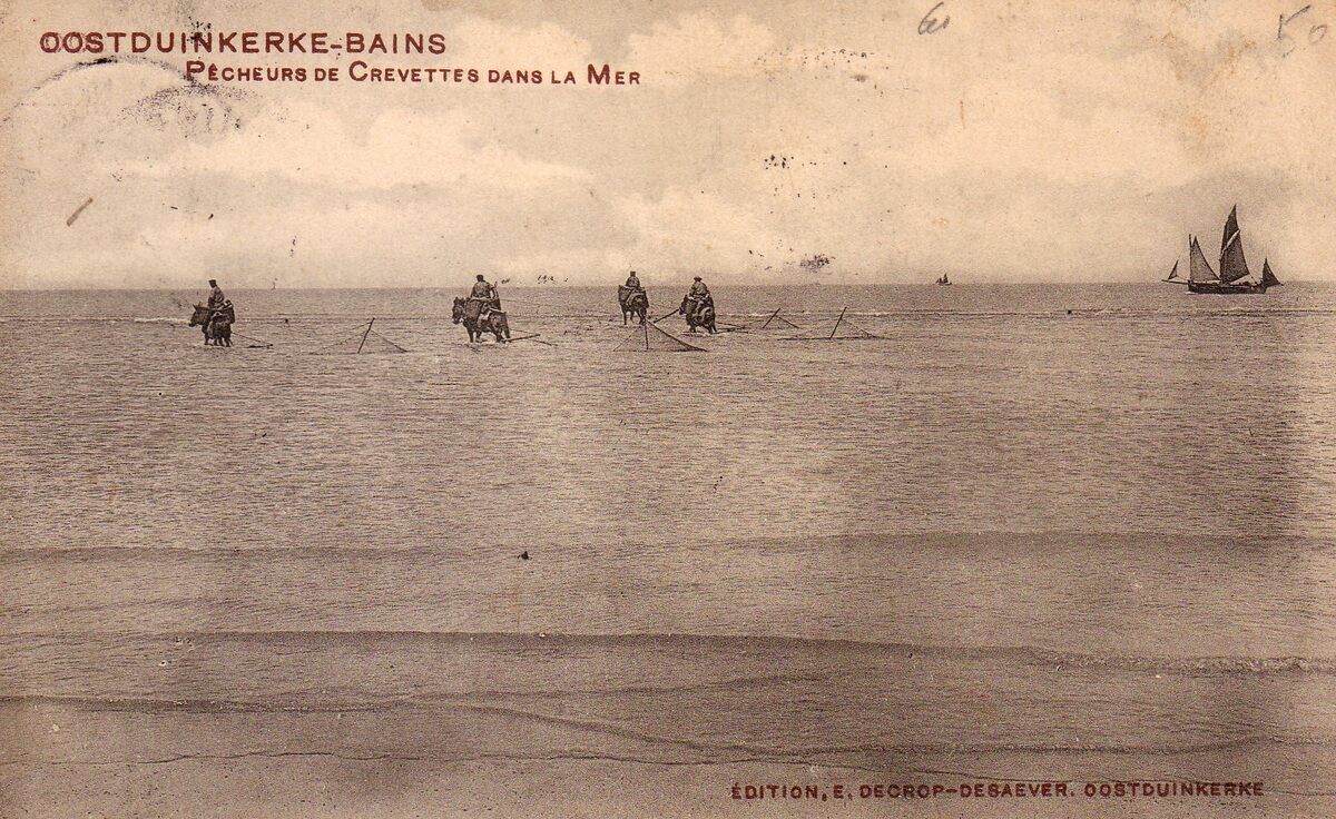 Edition, E. Decrop-Desaever, Oostduinkerke. - Oostduinkerke-Bains - Pêcheurs de Crevettes dans la Mer. - Tot voor 1955 werd de korre, een langwerpig net, opgehouden door een korrestok of beugel geplaatst in de schee. De schee was de schuine plank van ongeveer vier meter lengte en veertien centimeter breedte bij vijf centimeter dikte, en diende om de garnalen op te wekken. Ze schuurde een laagje zand van de zeebodem weg en de garnaal werd opgedreven. Aan de korrestok bevond zich de vierpeze (van vieren, laten schieten), een touw dat de visser bij het vangen nooit mag loslaten.