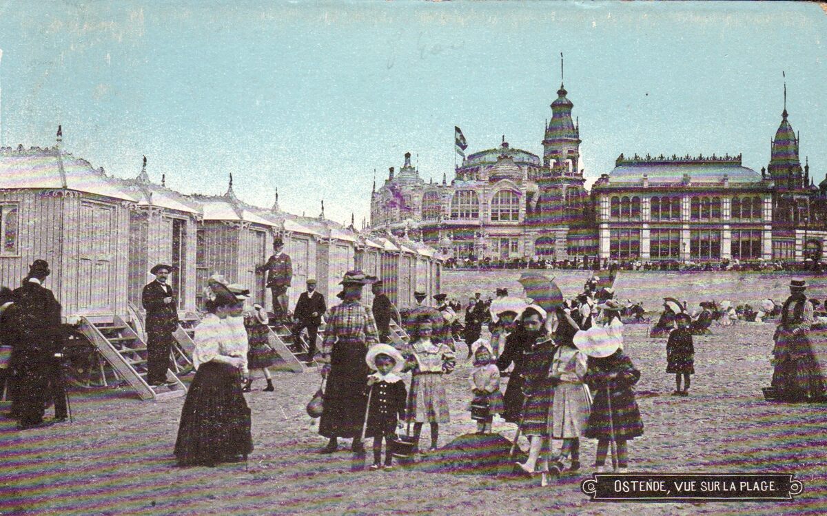 Ostende, vue sur la plage. - Op de achtergrond de westgevel van het derde Kursaal. Links enkele luxe-badkarren en spelende kinderen op het Groot Strand