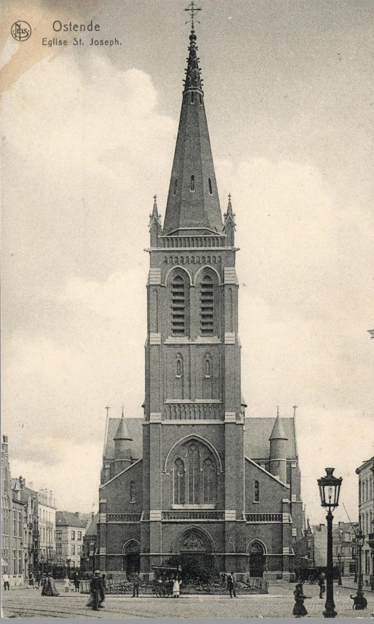 Formaat : 8,5 x 14 cm. - Nels, Bruxelles, Serie 13 N°30. - Ostende - Eglise St. Joseph. - Zicht op de Sint Jozefskerk vanuit de Rogierlaan. Let op de ijscokar.