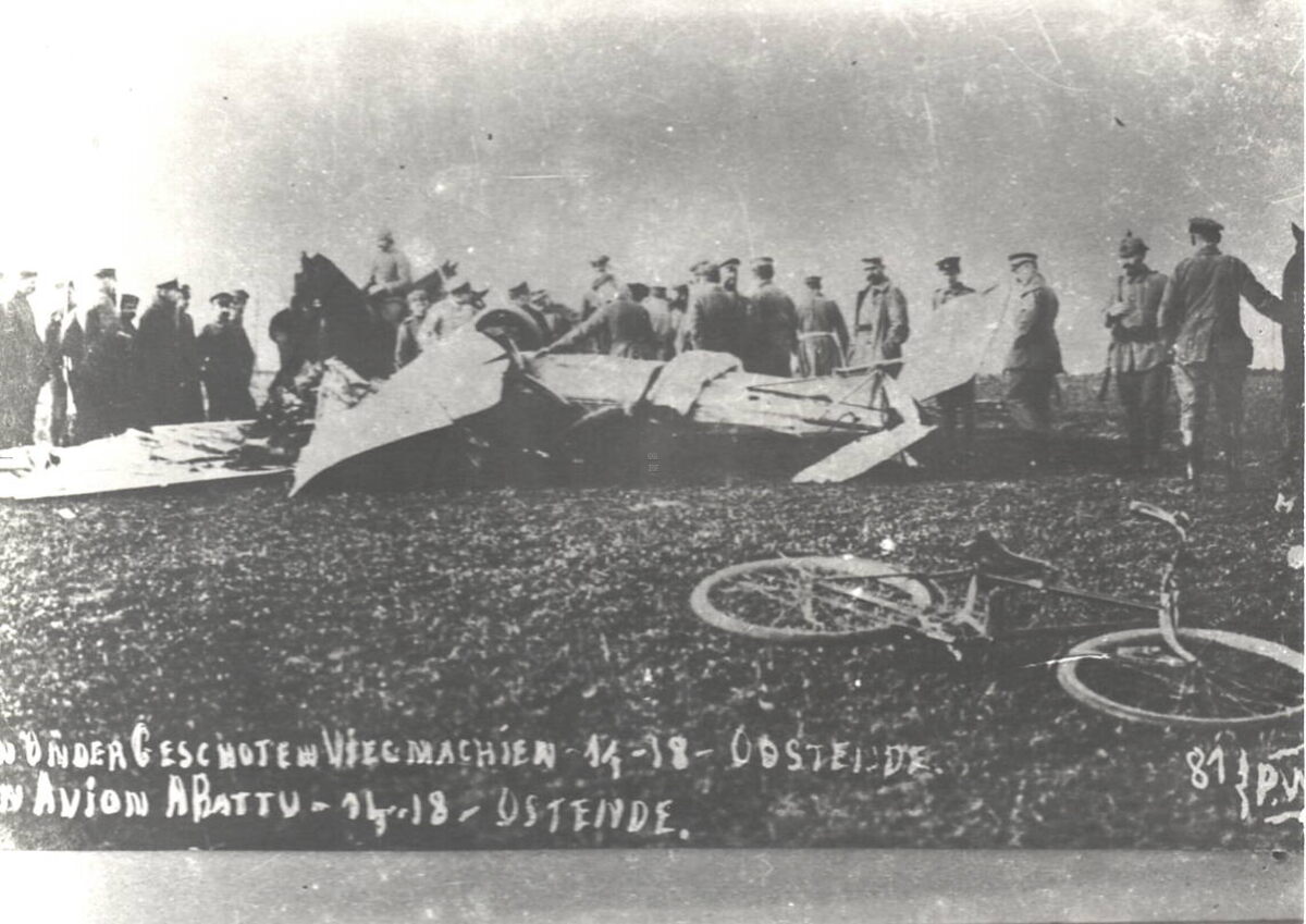 Neergestort nabij Oostende. Hier omringd door Duitse militairen.