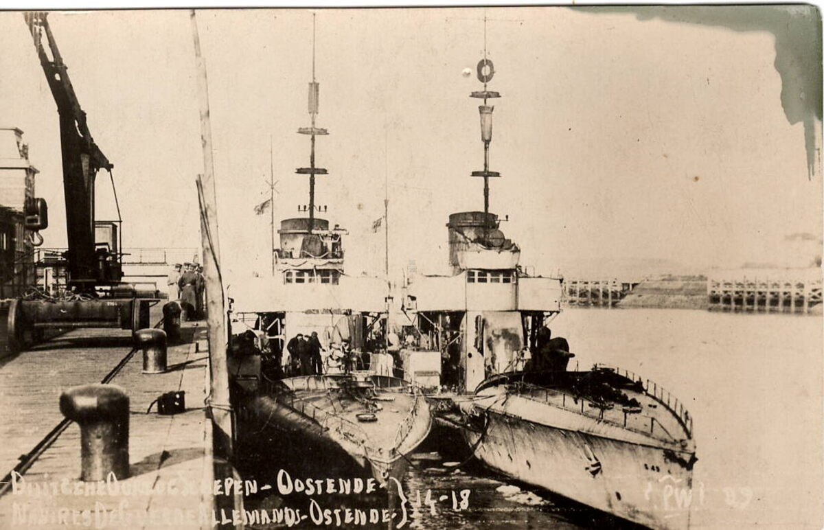 Duitsche oorlogschepen = Navires de guerre Allemands. Oostende 14-18 PW . - Twee schepen, A.II-klasse, van de torpedobotenflottielje "Flandern" aangemeerd aan de Pakketbotenkaai.