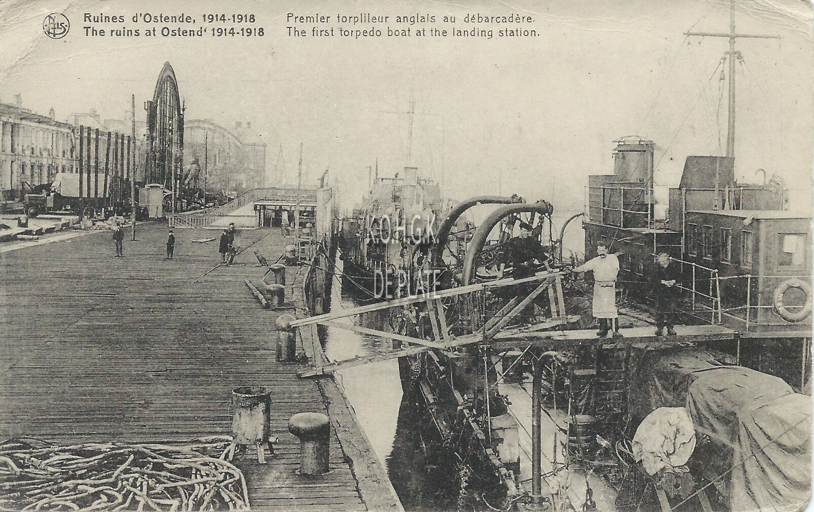 Nels. Edition J. Revyn, 14, rue du Canada, Bruxelles. - Ruines d'Ostende, 1914-1918 - Premier torpilleur anglais au débarcadère. The ruins at Ostend 1914-1918 - The first torpedoboat at the landing station. - Britse torpedoboten gemeerd aan de Aanlandingskaai, in de volksmond de "Débarcadère", nabij het vernield Zeestation. - Map 029A/62a
