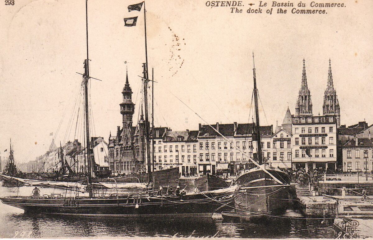 [Neurdein], ND Phot., nr.293. - Ostende - Le Bassin de Commerce. The dock of Commerce. - Vrachtschepen en vissersvaartuigen in het Eerste Handelsdok. Op de achtergrond, de Vindictivelaan. Vóór de Eerste Wereldoorlog, de Keizerskaai. Rechts zien we het Waterhuis, nu Brasserie 't Waterhuis. Er naast "Atlantic Hotel". Het gebouw met het torentje is het Zeevaartcommissariaat, in de volksmond "De Pilotage" ganoemd. We zien ook nog de torens van de Sint Petrus en Pauluskerk.
