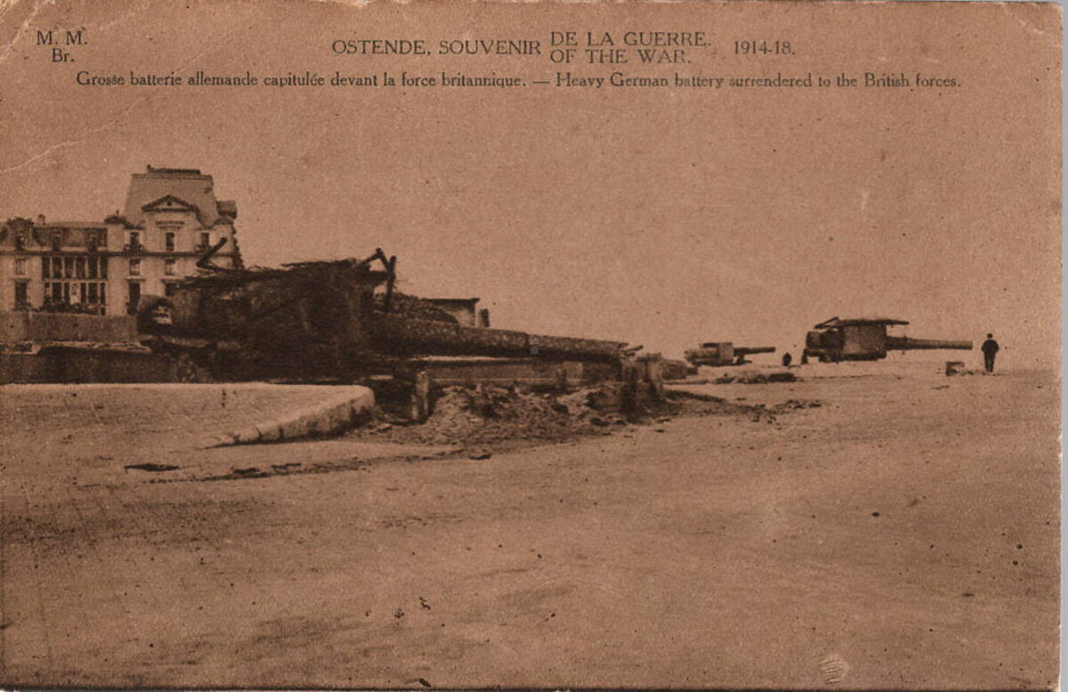 M.M.Br. - Ostende, souvenir de la guerre. of the war 1914-18. Grosse batterie allemande capitulée devant la force britannique. Heavy German battery surrendered to the British forces.- Links detail van het "Royal Palace Hotel". Foto genomen na de oorlog.