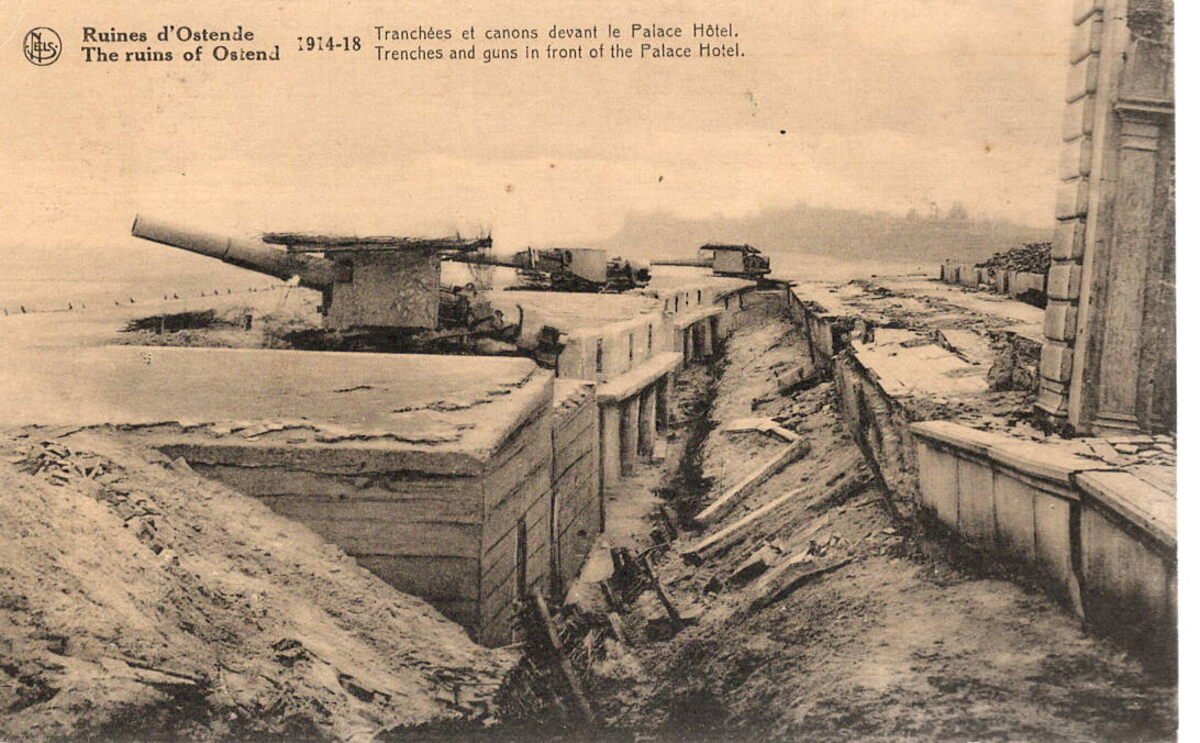 Nels. Edition J. Revyn, 14, rue du Canada, Bruxelles. - Ruines d'Ostende 1914-18 : Tranchées et canons devant le Palace Hôtel. The ruins of Ostend 1914-18 : Trenches and guns in front of the Palace Hotel. Rechts, detail van de gaanderijen van het" Royal Palace Hotel", door de Duitsers afgebroken tegen afketsend vuur. Foto genomen na de oorlog.
