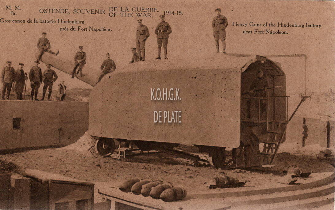 M.M.Br. - Ostende, souvenir de la guerre. of the war 1914-18. Gros canon de la batterie Hindenburg près du Fort Napoléon. Heavy Guns of the Hindenburg battery near Fort Napoleon. - Batterij Hindenburg werd gebouwd op de Oosteroever nabij het Fort Napoleon midden de oefenpiste van de "Société des Courses d'Ostende". Opname van na de oorlog.
