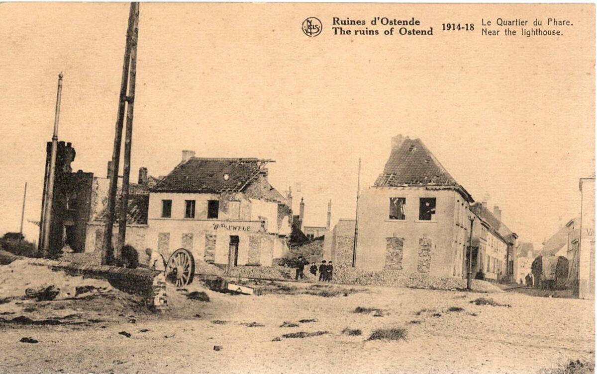 Nels. Edition J. Revyn, 14, rue du Canada, Bruxelles. - Ruines d'Ostende. The ruins of Ostend 1914-18. Le Quartier du Phare. Near the lighthouse. - Eerste beschieting met zwaar geschut vanop drie Britse monitors op 7 september 1915. De herberg van de weduwe Anna Pauwels gelegen op de Vuurtorenweg nr. 5 en het huis nr. 7 werden geraakt. In : Oostende 14-18 : deel 2 / Ferdinand Gevaert, Freddy Hubrechtsen. 1996. p.89. Plate bib B229.