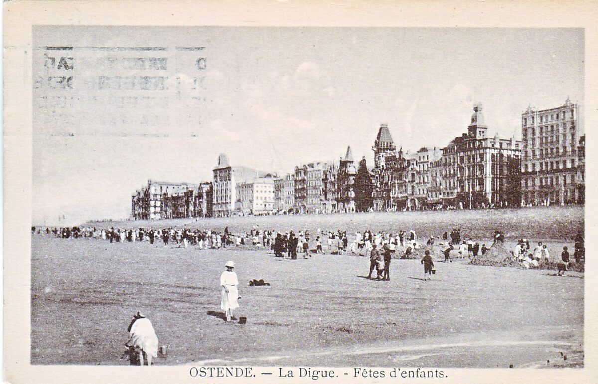 Le Bon. - Ostende - La Digue. Fêtes d'Enfants. - De Zeedijk ten oosten van de kursaal richting de havengeul. Strandrecreatie op het Groot Strand. Op de achtergrond is er een wedstrijd voor kinderen, zandkastelen (forten) bouwen.
