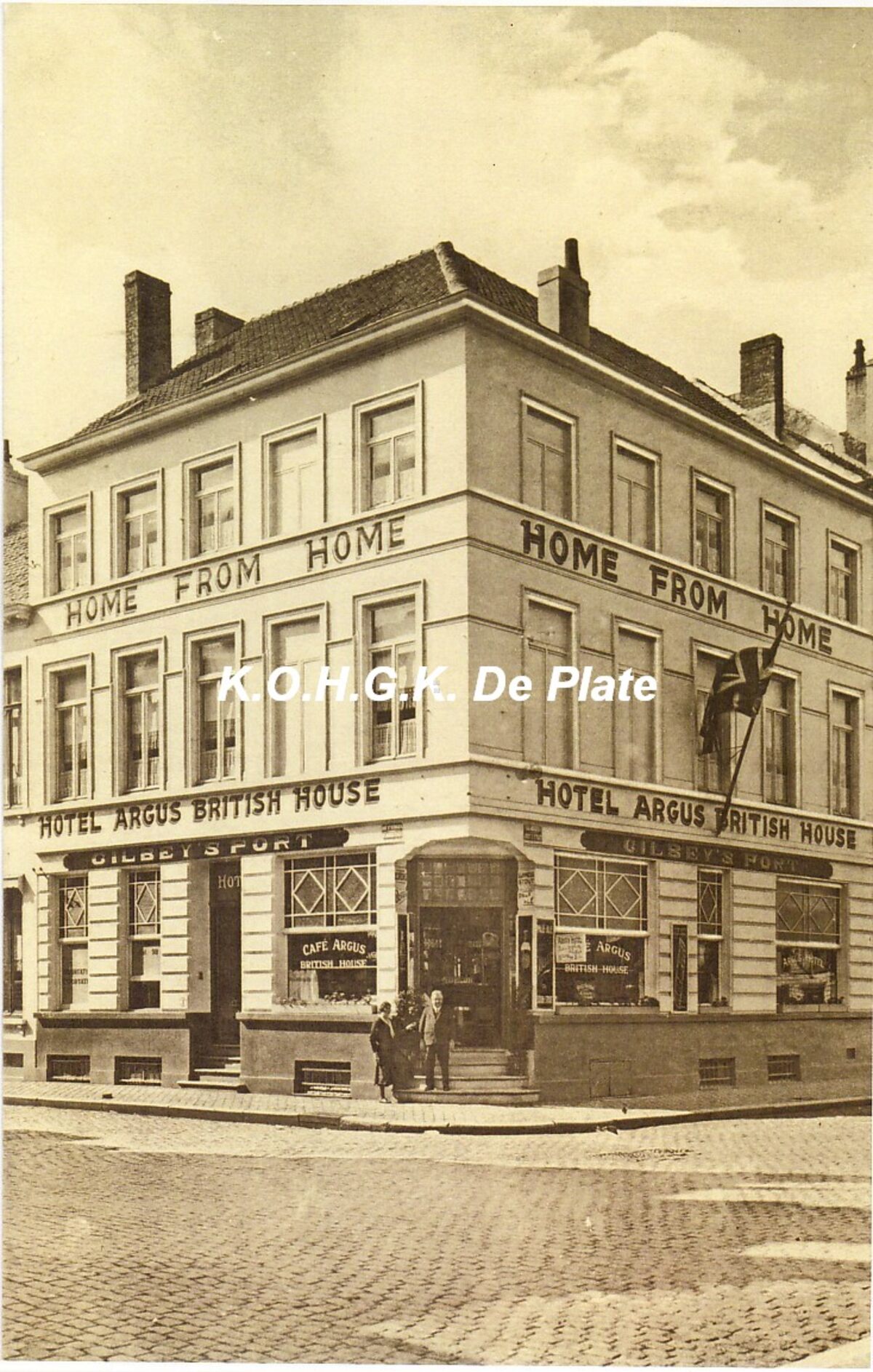 Afdruk. - Formaat : 29 x 19 cm. - Home from home. Hotel Argus British house. Het Hotel Argus, gelegen op de hoek van de Sint-Jorisstraat (links) en de Jozef II-straat (rechts). Dit hotel was bijna uitsluitend gericht op een Engels cliënteel. Het werd toen uitgebaat door de heer F. Gould