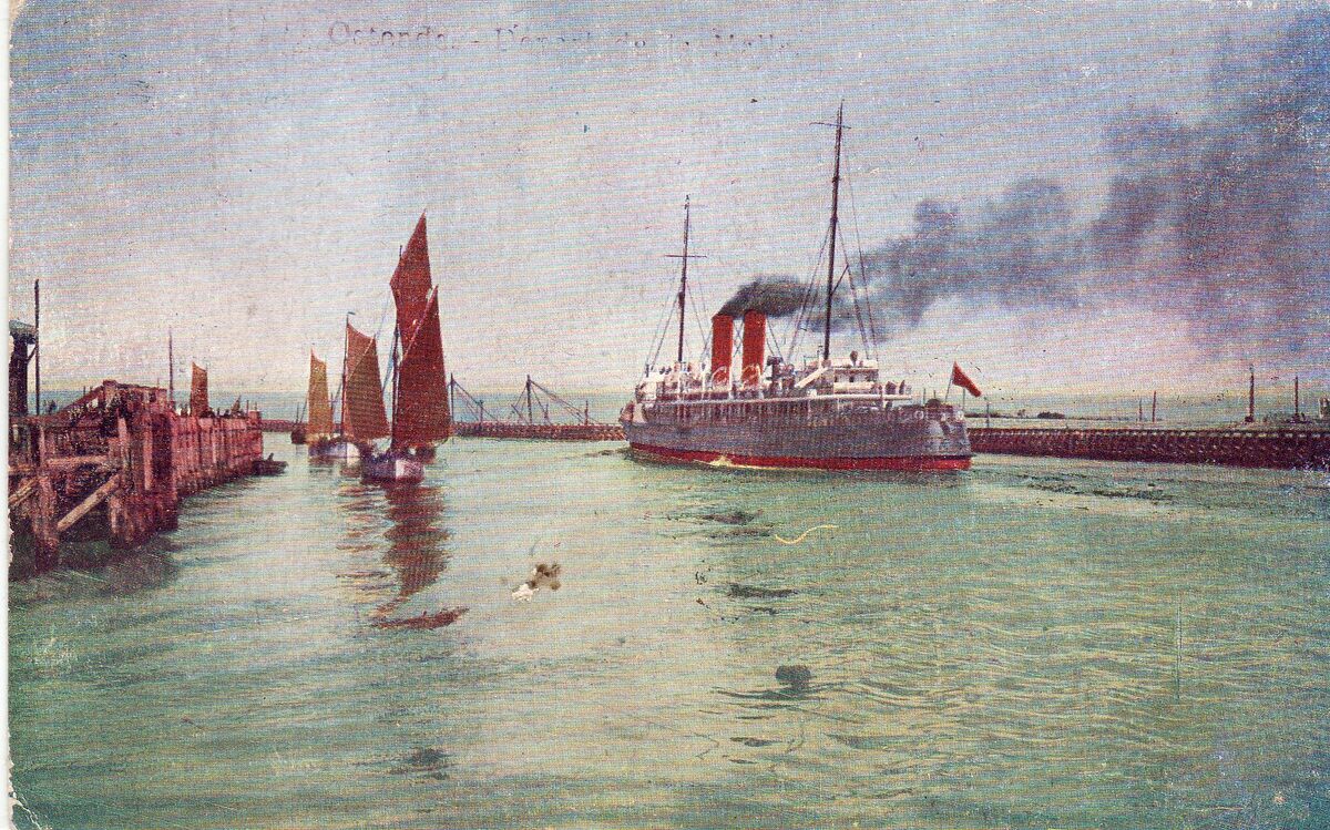 Départ de la malle. - Bijgekleurde kaart. - Zeilvisserssloepen varen de haven binnen, terwijl de pakketboot "Stad Antwerpen" buiten vaart. Links, het Weststaketsel en rechts, het Ooststaketsel