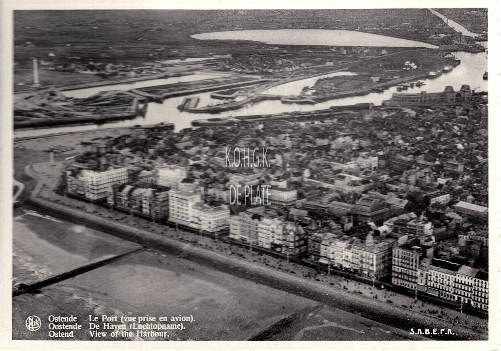 Formaat : 10 x 15 cm. - Nels. S.A.B.E.P.A. - Ostende - Le Port (vue prise en avion). Oostende - De haven (Luchtopname). Ostend - View of the Harbour. - Luchtopname van de haven, Zeedijk-, Centrum- en Visserskwartier. Links boven, de derde vuurtoren in het wit geschilderd, het Visserijdok met aangrenzend de Vuurtorenwijk. De nieuwe vismijn is nog niet gebouwd. Achteraan de Spuikom. De havengeul met het Zeewezen- en Tijdok. De Zeedijk met de hotels en villa's. - (Opname onder voorbehoud ca.1926-1930).