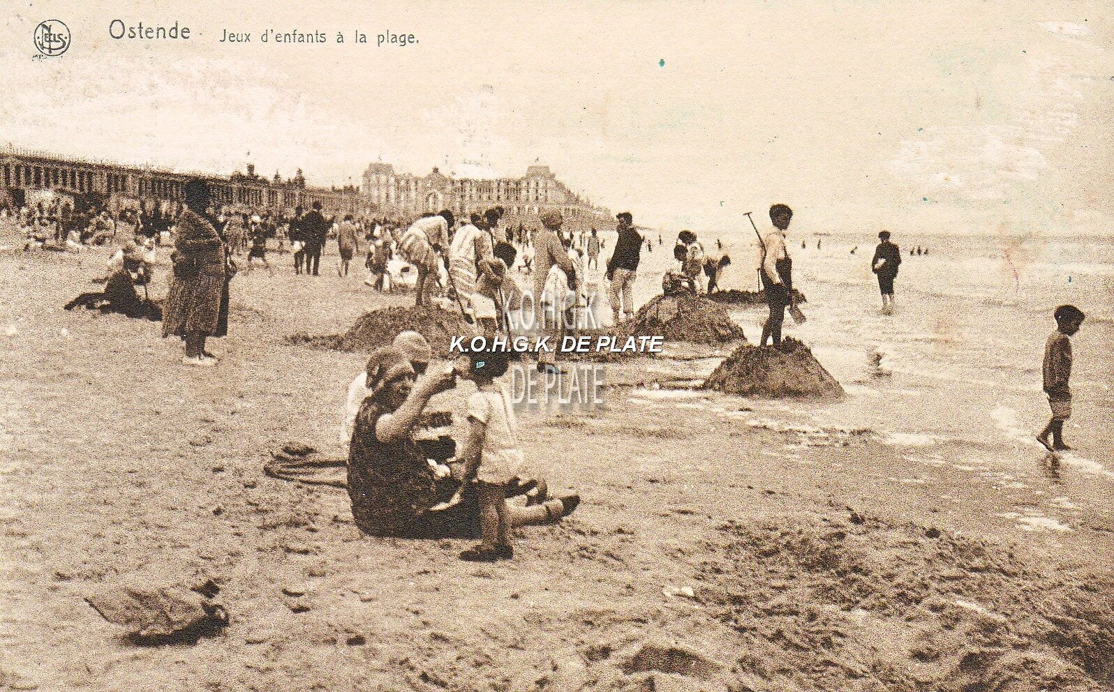 Nels, série 13, N° 77. - Ostende - Jeux d'enfants à la plage. - Kinderen bouwen een "fort" of zandkasteel op het Groot Strand. Links, de Koninklijke Gaanderijen langs de Zeedijk. Op het einde het "Royal Palace Hotel"