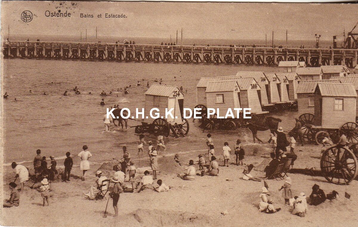 Nels. Ostende - Bains et Estacade. - Strandrecreatie op het Klein Strand. De traditionele badkarren in gebruik tot eind de dertiger jaren. Op de achtergrond, het Weststaketsel