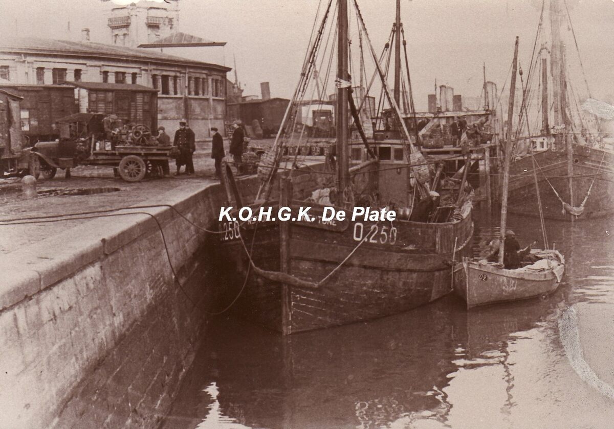 Formaat : 15 x 10.5 cm. - Het vaartuig aangemeerd in de oude visserskreek nabij de oude vismijn (de cirk). - De O.250 "Neptune" gebouwd in 1918 door de firma van Dam te Vlaardingen als zeillogger SCH.366 "Concordia Constant". 1 dek, 2 masten en een hulpmotor Bolinder, H.P. 200. Bruto tonnenmaat : 92,49 en netto tonnenmaat : 36,59. Vanaf 04/10/1930 eigendom van H. Aspeslagh. Meetbrief nr. 1865 van 12/11/1930. Brief van eigendom nr. 3346 van 04/10/1930. Er naast ligt de O.2 "Zoé" een Oostendse schover eigendom van Saelens, uit de Sint Paulusstraat 34