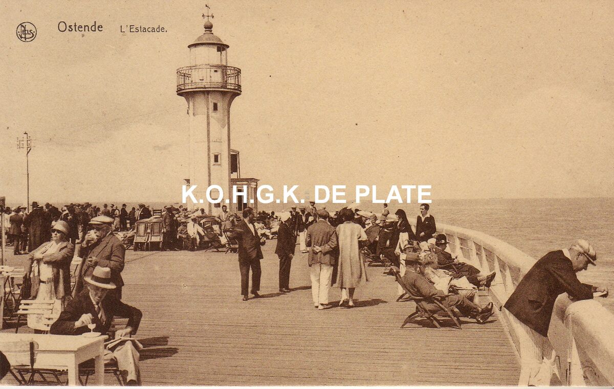 Nels. - Ostende - L'Estacade. - Het einde van het Weststaketsel met het ijzeren torentje en mistbel. Het was altijd genieten van de zeelucht. Oostende in het interbellum