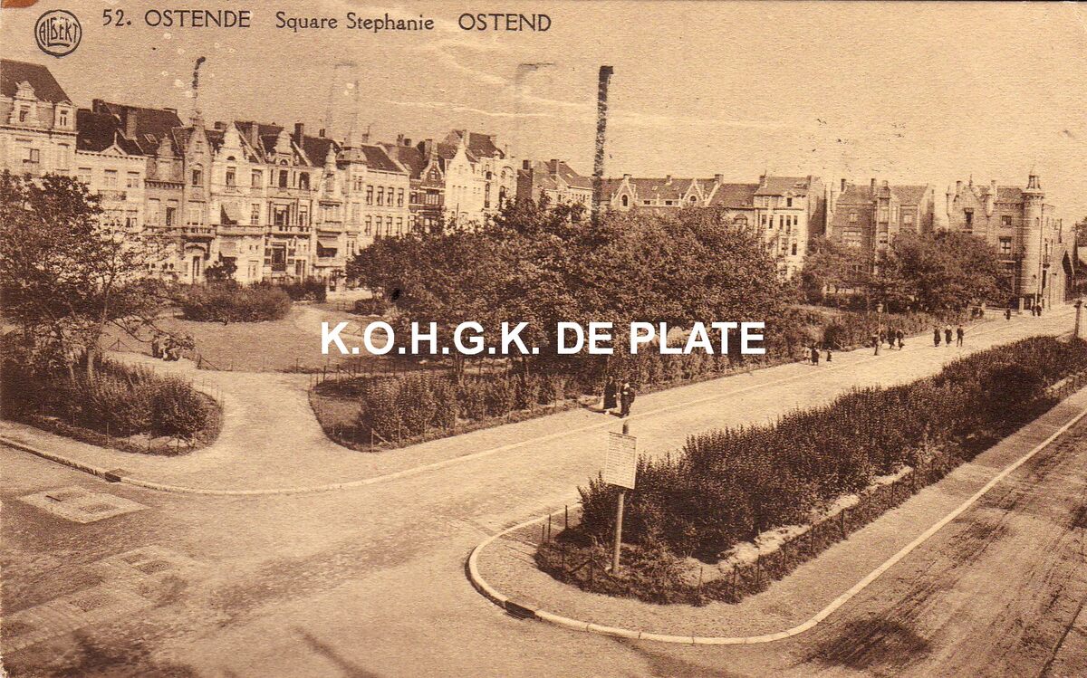 Albert, N° 52. - Ostende - Square Stéphanie. - Genaamd naar de dochter van Leopold II. Rechthoekig plein dat samen met het Prinses Clementinaplein de in 1889 aangelegde Koninginnelaan verfraaien. Deze twee squares werden aangelegd naar het ontwerp van landschapsarchitect E. Lainé. Concentrische parkaanleg met graspartijen, bomen, bloemenperken, paden en zitbanken. Bijzonder : persoonlijke tussenkomst van Leopold II in de selectie van kanditaat-kopers en behandeling van de bouwaanvragen. Vooraan, de Koninginnelaan