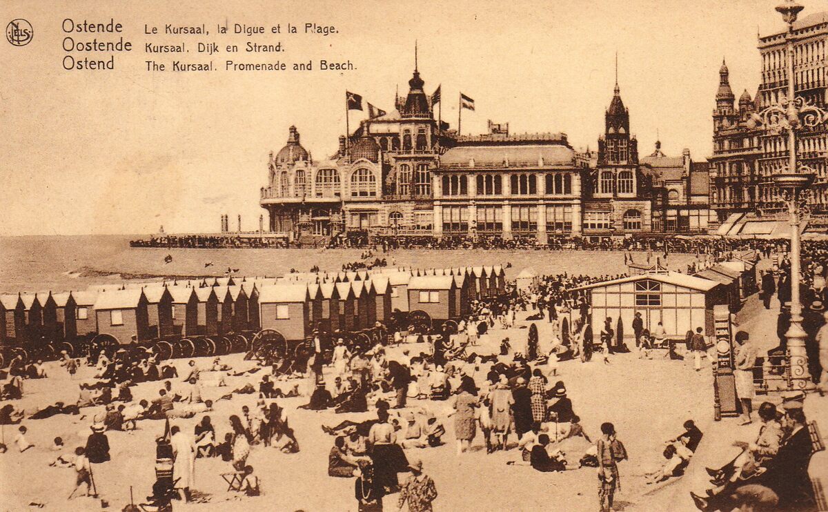 Nels. - Ostende - Le Kursaal, la Digue et la Plage. Oostende - Kursaal. Dijk en Strand. Ostend - The Kursaal. Promenade and Beach. - Strandrecreatie op het Groot Strand met wat verder de traditionele badkarren. Op de achtergrond, de westgevel van het derde Kursaal langs de Zeedijk.