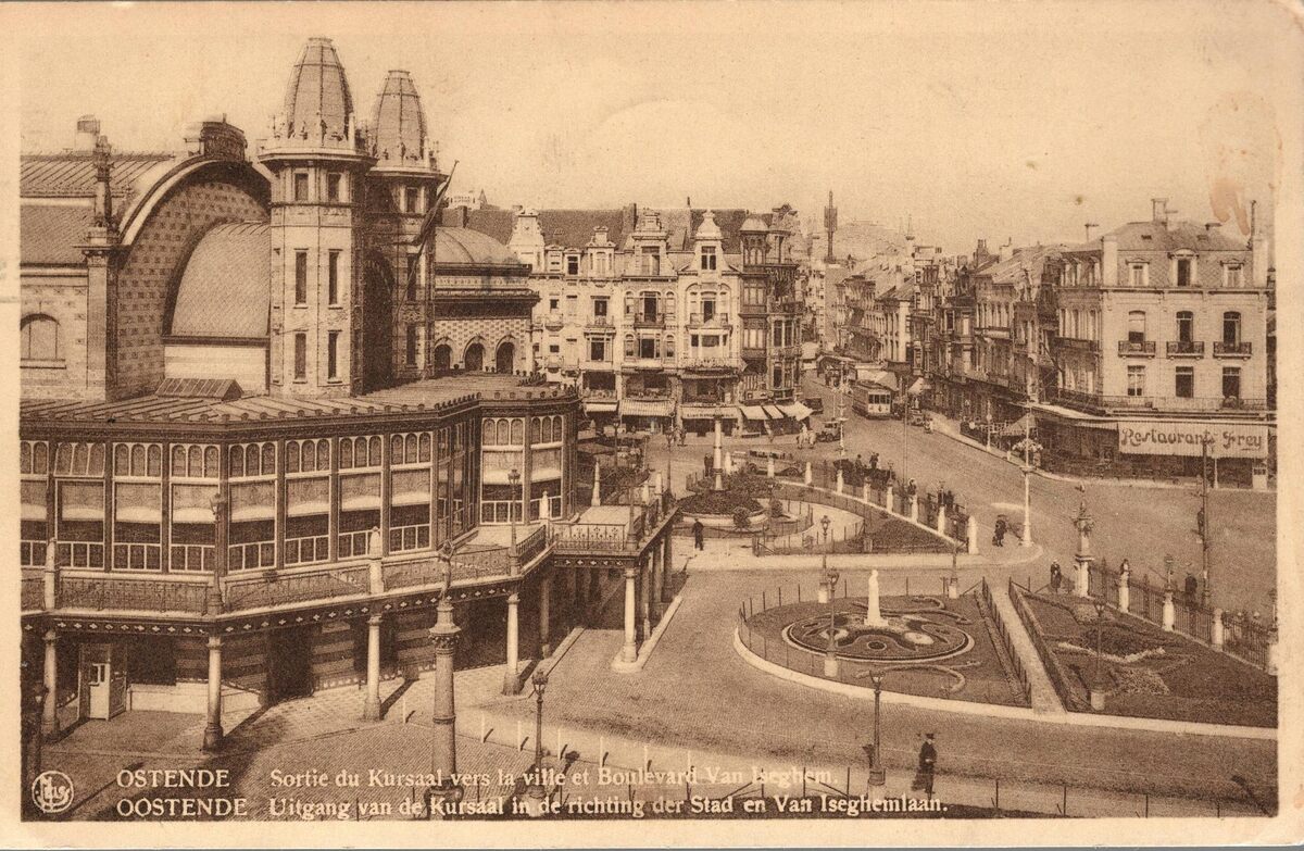 Nels. Ern Thill, Bruxelles, série 13, n° 56. - Ostende - Sortie du Kursaal vers la ville et Boulevard Van Iseghem. Oostende - Uitgang van de Kursaal in de richting der Stad en Van Iseghemlaan. - De zuidgevel van het derde Kursaal gezien vanaf de Kursaal-Westhelling, richting de Van Iseghemlaan. Wat verder rijdt een stadstram. Vooraan, de hovingen met het borstbeeld van James Ensor.