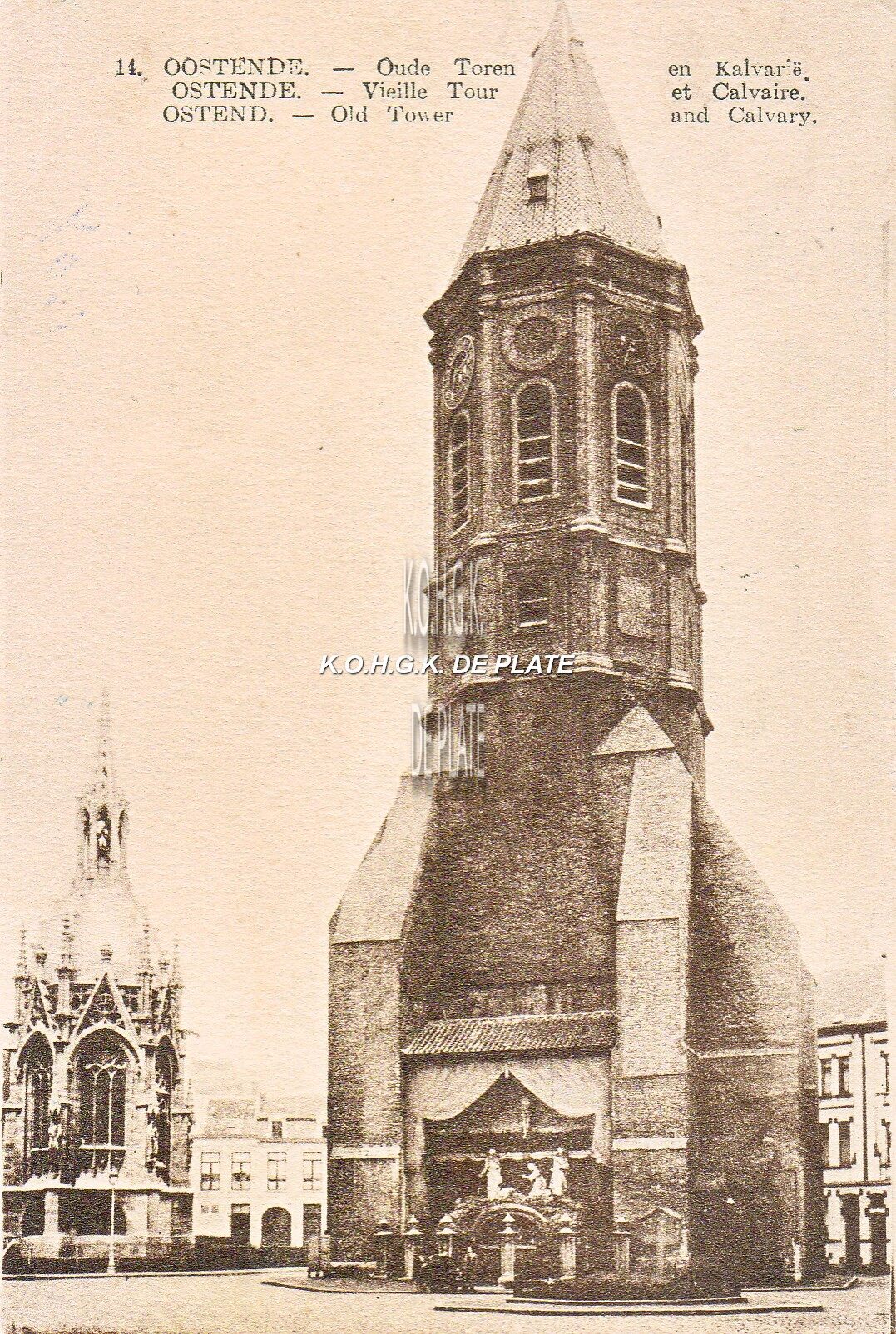 Postkaart C.D.O. 14. - Het Vagevuur aan de voet van de oude toren van de Sint-Pieterskerk (bijgenaamd de Peperbusse). De kerk werd door brand verneld op 14 augustus 1896. Op de achtergrond, een gedeelte van de Sint-Pietersstraat. Links, een gedeelte van de Koninginnekapel van de Sint Petrus- en Pauluskerk